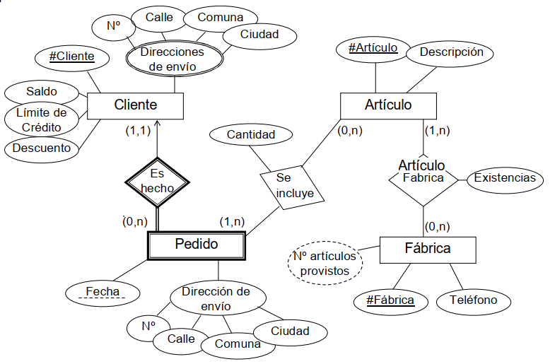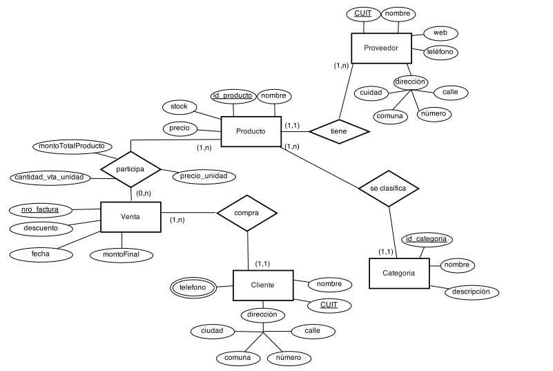 Un proveedor tiene un CURP, nombre, dirección, teléfono y página web. Un cliente también tiene CURP, nombre, dirección, pero puede tener varios teléfonos de contacto. La dirección se entiende por calle, número, comuna y ciudad.