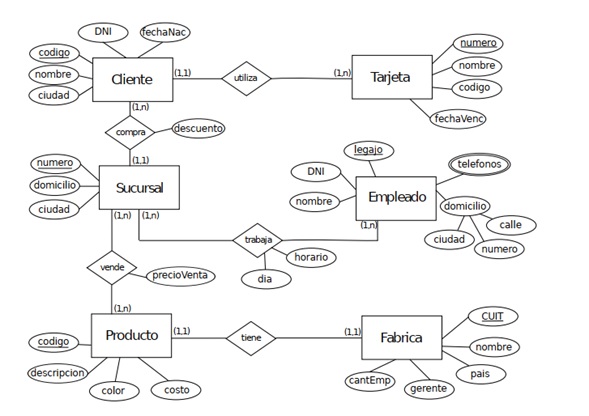 Una cadena de casas de deportes desea realizar una base de datos para manejar sus sucursales, empleados, productos y clientes .De las sucursales se sabe el número único que la identifica dentro de la cadena, el domicilio y la ciudad .De los empleados el legajo, el nombre, el dni, el domicilio (calle, número y ciudad) y los números de teléfono en los cuales puede ser contactado .Los empleados trabajan en diferentes sucursales en diferentes días de la semana y en cada sucursal tiene asignado un horario en particular, que puede no ser el mismo en diferentes sucursales. Por ejemplo, el empleado GBA trabaja los lunes de 9hs. a 18hs. en la Sucursal 1, y los martes de 10hs. a 20hs. en la Sucursal 2. En cada sucursal trabajan varios empleados. De los productos se conoce un código, una descripción, un color y un costo fijo de fabricación. A su vez, existen también las fábricas que son identificados con CUIT, nombre, país de origen, cantidad de empleados y nombre de gerente. Cada producto es fabricado en una sola fábrica, y cada fábrica solamente realiza un tipo de producto. El costo fijo de fabricación no depende de la fábrica. Cada sucursal puede vender varios productos, y a su vez, cada producto puede ser vendido por varias sucursales. Cada sucursal establece cuál es el precio del venta del producto que ofrece. Es decir, un mismo producto podría tener diferentes precios en diferentes sucursales. De los clientes se conoce el código de cliente, el dni, el nombre, la fecha de nacimiento y la ciudad en la que vive. A su vez, también sabemos que cada cliente puede utilizar varias tarjetas de crédito, que son identificadas por el nombre de la tarjeta, el número, el código de seguridad y la fecha de vencimiento. Cada cliente solamente realiza compra en una sola sucursal, y en una sucursal pueden comprar varios clientes. Cada sucursal le ofrece a sus clientes un descuento fijo por su fidelidad en las compras .